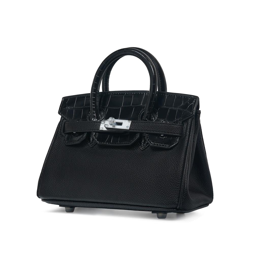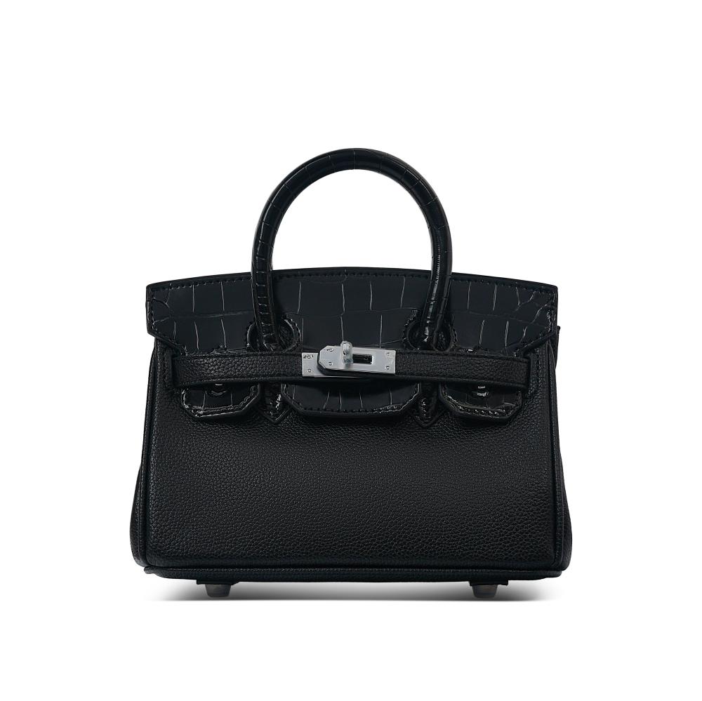شنطة ميني بيركن باللون الأسود بجلد التمساح تجمع بين الفخامة والحجم المثالي لتلبية احتياجاتك اليومية.